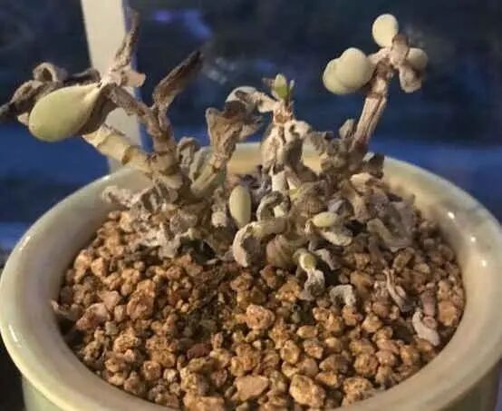 将修好根的多肉都放在一个平盘里,然后放在背阴的地方晾根,不要接受阳光直射,让根系在阴凉处慢慢干燥,时间不能太短,视天气情况,约7—10天的时间。在这个过程中,叶片可能因为缺水而出现表皮微皱的现象,这个不用担心,服盆以后会恢复的。