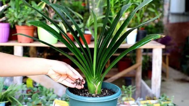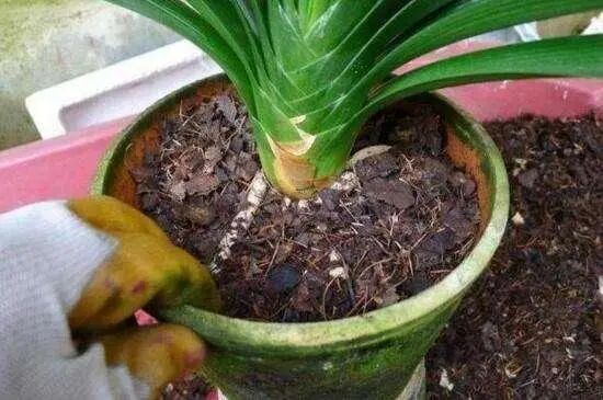首先,我们把君子兰的植料里面加上一些水,把植料调成微微潮湿的状态,用潮土上盆后,不需要浇水,能降低根系感染、腐烂的概率。