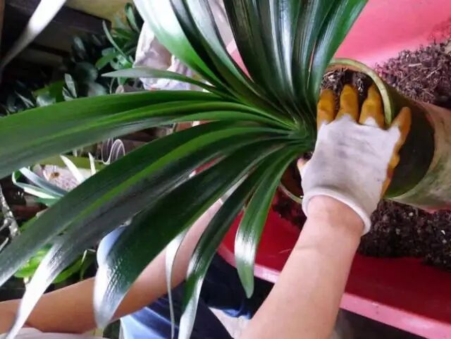 栽种君子兰的植料疏松、透气性比较好,等植料干透后,给它脱盆也比较简单。右手握住君子兰的假鳞茎处,左手托住盆底,慢慢地将花盆倾斜,君子兰很容易就脱盆了。