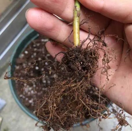 给月季脱盆后,去掉下部、上部、周围大约2/3的土壤,保留护心土,再用新的营养土上盆。