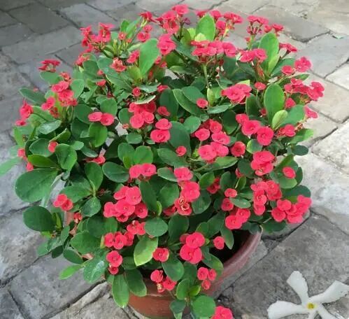 虎刺梅是一种灌木植物,它的叶片四季翠绿,四季开花,虎刺梅是最好养的开花植物,只需要晒晒太阳,浇水的时候加入一些磷酸二氢钾,就能一年到头都开花,是名副其实的开花机器。