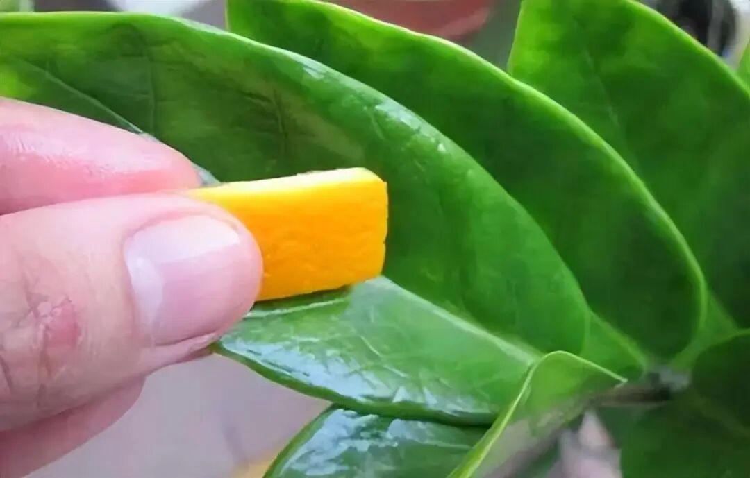 我们也可以把桔子皮切成长方形,再把它削薄,然后用桔子皮擦拭叶片。桔子皮的汁水不仅可以把叶片清洁干净,叶片上留下的汁水还能给叶片增加养分。