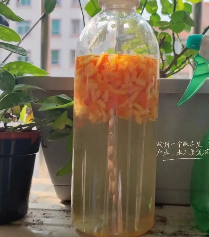 准备一个大的密封容易,比如塑料饮料瓶,把桔子皮清洗干净切成小块,装在瓶子里,再倒入9分满的清水,桔子皮和清水的比例在1:2左右,拧紧盖子放在光照充足且温暖的位置。