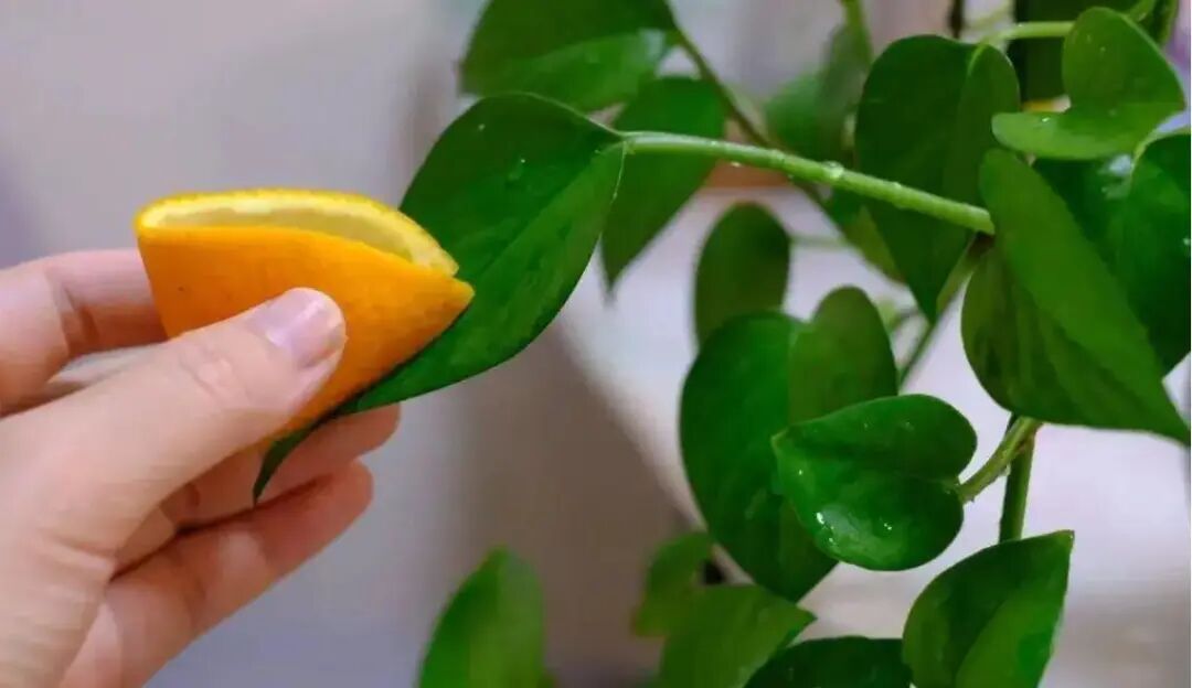 四、用桔子皮擦叶片,清除灰尘,促进营养吸收,叶片油亮喜人
