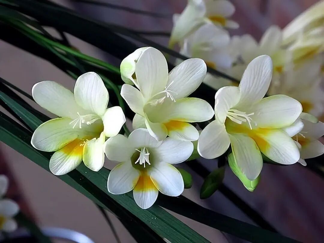 小苍兰也叫香雪兰,是鸢尾科香雪兰属的多年生球根花卉 ,它的叶子为线条状,较为坚硬,花色 有黄、白、紫、红、粉红等颜色,穗状花序,花好生长在一侧,非常优雅大气,它于早春时节开花,花期集中在2-5月份,开花时香气怡人,浓淡适宜,是一种带有甜味的花香,非常清新典雅,室内放置一盆的话,满室清香。
