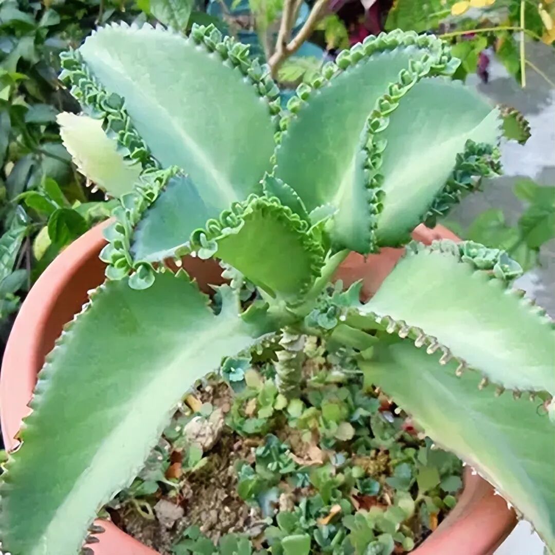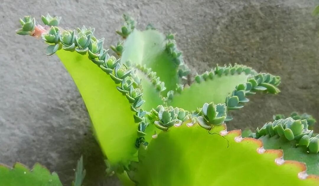 大家可以看一下,它的叶片周围能长出很多小的不死鸟,成熟之后,就会自动脱落,落地沾上水土就能生根,变成一株新的不死鸟,一个叶子就能长出很多,而且会不停的长,所以它的泛滥能力真的很强,说它是“流氓花”,一点也不夸张 。