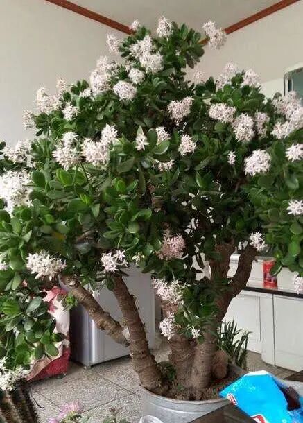 玉树喜光,在光照充足的环境下,枝干粗壮,老化成木质,叶片肥厚,油亮有光泽,不徒长,而且株龄达到5年左右,就具有开花的能力,多晒并适量的控水,能促进它开花,它的花期和长寿花相似,一般在冬春时节,盛开之后,满树繁花,是真正的“玉树琼花”,美丽又吉祥。