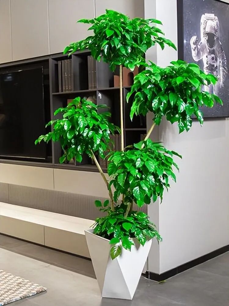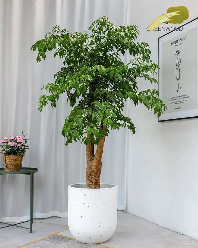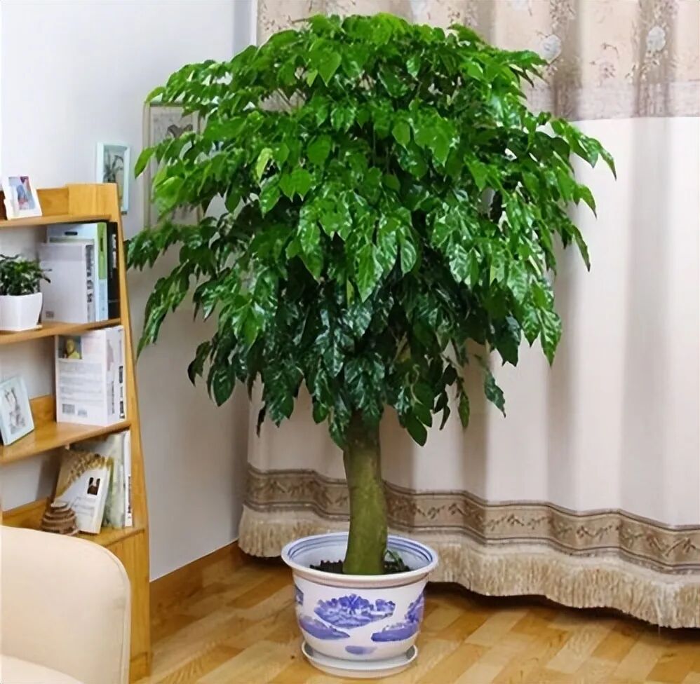 幸福树的枝叶密集,四季翠绿,生长一层一层的,叶柄较长,犹如一把大大的凉伞,所以它还有“接骨凉伞”的美誉,整个株型树影婆娑,姿态飘逸,颇有一股南国风情,放在家里,大家又吉祥。