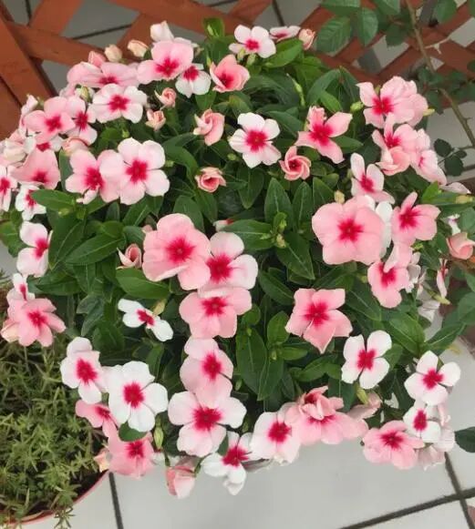 长春花生根之后,长得极快,只要光照充足,肥水得当,很快就有开花,不过小苗期的时候,可以不着急让它开花,先通过不停的打顶摘心,让它不停的发新枝,很快就能开成大花球。