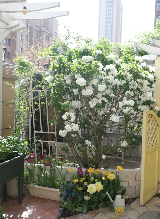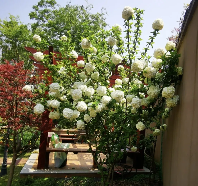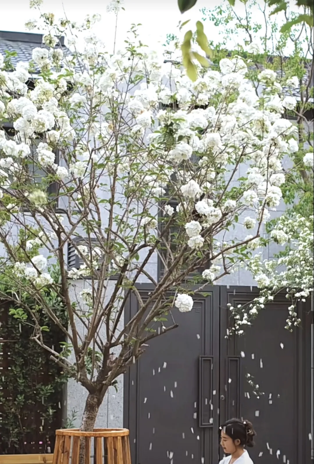 中华木绣球是“玉树”在民间的代称,盛开之后,花色白或是浅绿,一般是开得越久,颜色越淡,是有名的“玉树琼华”的美誉,盛开之后,清新典雅,满满的高级感,和中式庭院很搭配,能及大的提升院子的格局。