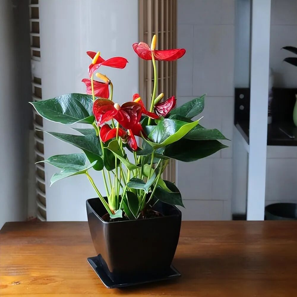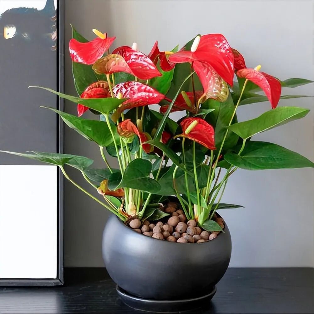 红掌在生活有很常见,因为常年开花,几乎能做到天天开花,花色大多是娇艳喜庆的大红色,所以有“红红火火”的美好寓意,因为它好养开花时间长,且对光照的要求不高,花叶俱美,没有特殊的气味,所以养在客厅很合适、特点适合点稍小的客厅。