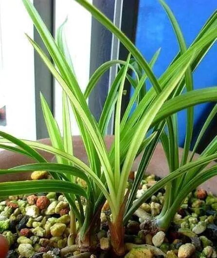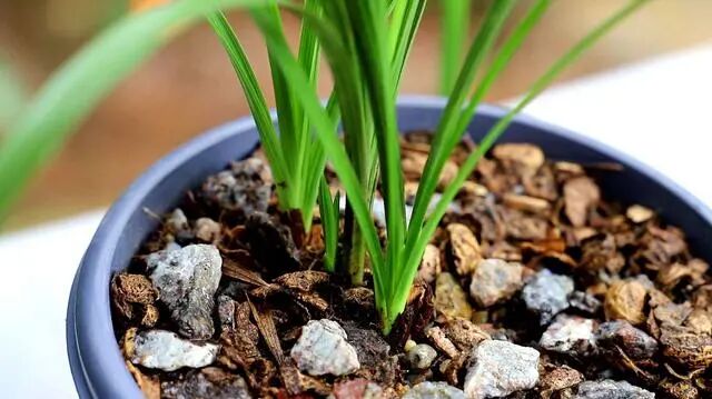 然后把兰株置于盆中,注意控制深度和位置,不要种偏了,也不要种得太深,然在兰株的周围加入植料,轻拍花盆的外墙壁,并且小木棍将植料拔到根系的缝隙、空洞里,然后继续加入植料,再轻拍花盆,以让兰根与植料充分接触,植料添加加至接近假鳞茎为止,然后用铺面石覆盖盆面,浇透定根水,然后放在阴凉通风处。