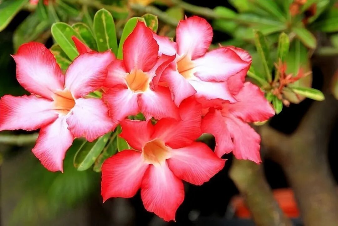 沙漠玫瑰开花很漂亮,因为原产地接近沙漠,慢慢的它就进化出一个粗大的瓶茎根,能储水,较耐,怕积水,所以养沙漠玫瑰,不能多浇水,一般是盆土表面发再浇水,不可浇水过多。