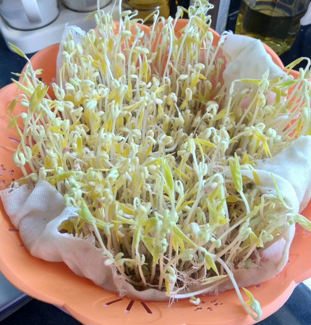 建议大家可以多泡一些,生出的绿豆芽炒菜吃,非常可口。当绿豆泡发,外皮破开,长出小芽的时候,就说明泡好了。