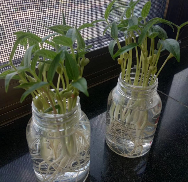 豆芽在水里的生长速度是非常快的,生命力非常旺盛,上面的小芽就会变成一片片的小叶子,叶子慢慢长大,变得越来越油绿,之前的长芽也会长成挺实的枝条。