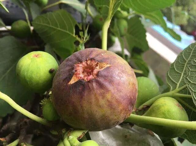 另外一点,就是雨季中,一直把盆栽无花果放在会淋得到雨水的地方养,这样盆土持续潮湿积水,果子也会膨胀,不仅容易掉果,果子还没有成熟就导致霉烂,还容易让成熟的果子,口感变得很差。