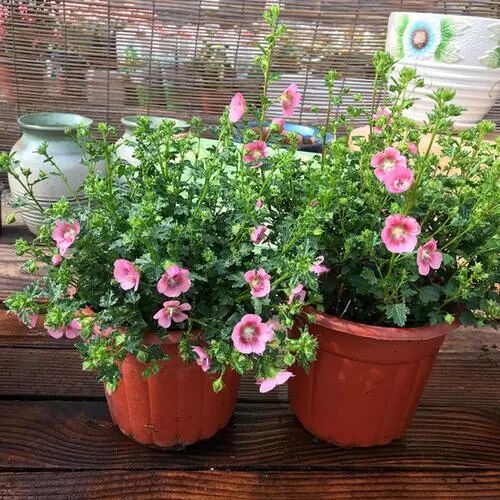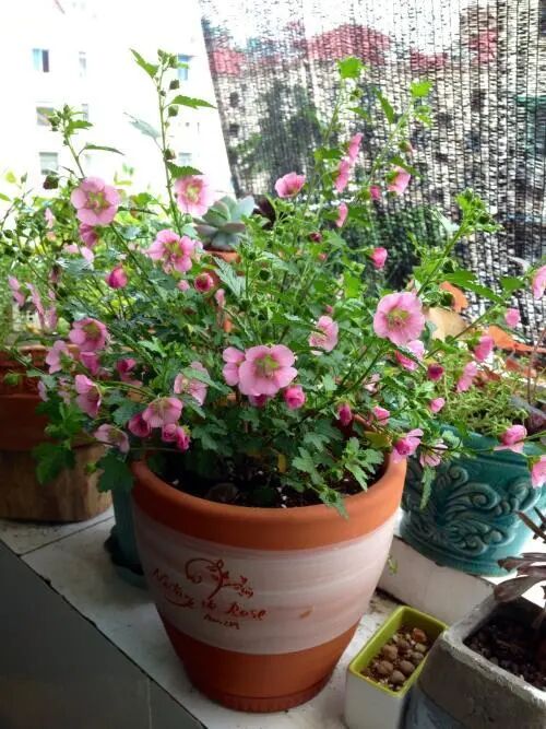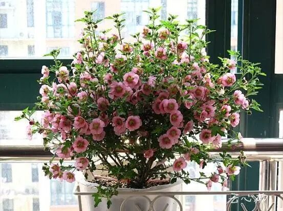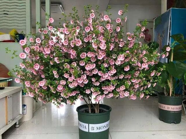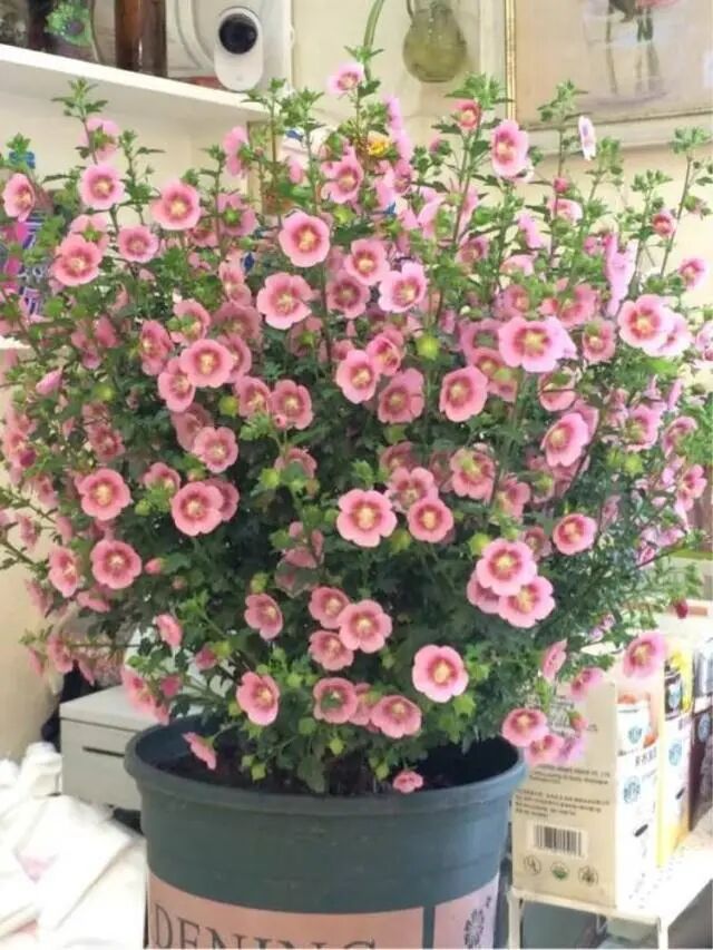 这个花就是小木槿,是一种漂亮好养花期长的花卉,而且还能通过修剪,养成棒棒糖,高档又大气,放在那里都好看,开了盛花期,一棵小木槿都开出上百朵花。
