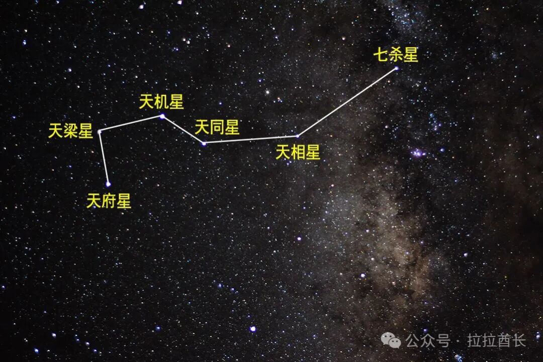 而在我们中国人的神话中,人马座这个星座中的μ、λ、φ、σ、τ、ζ六颗星,组成了一个勺子的形状,勺子最前端的ζ和τ两颗星的连线指向牛郎星,这么的六颗星也就是和“北斗七星”所相映的“南斗六星”。
