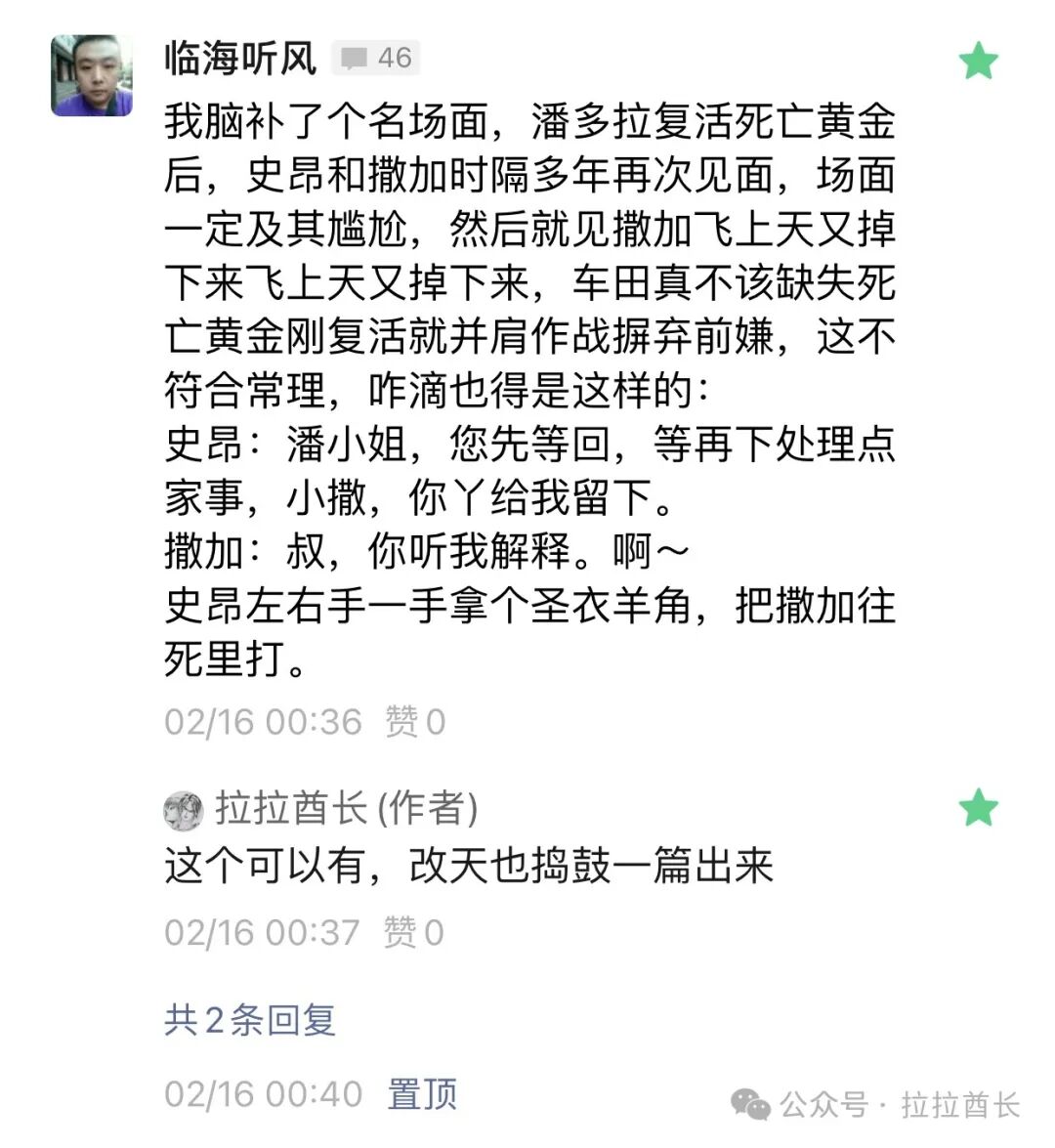 潘多拉复活死亡黄金后,史昂和撒加时隔多年再次见面,场面一定及其尴尬,然后就见撒加飞上天又掉下来飞上天又掉下来。车田真不该缺失死亡黄金刚复活就并肩作战摒弃前嫌,这不符合常理,咋滴也得是这样的:史昂:潘小姐,您先等回,等在下处理点家事,小撒,你丫给我留下。撒加:叔,你听我解释。啊~史昂左右手一手拿个圣衣羊角,把撒加往死里打。