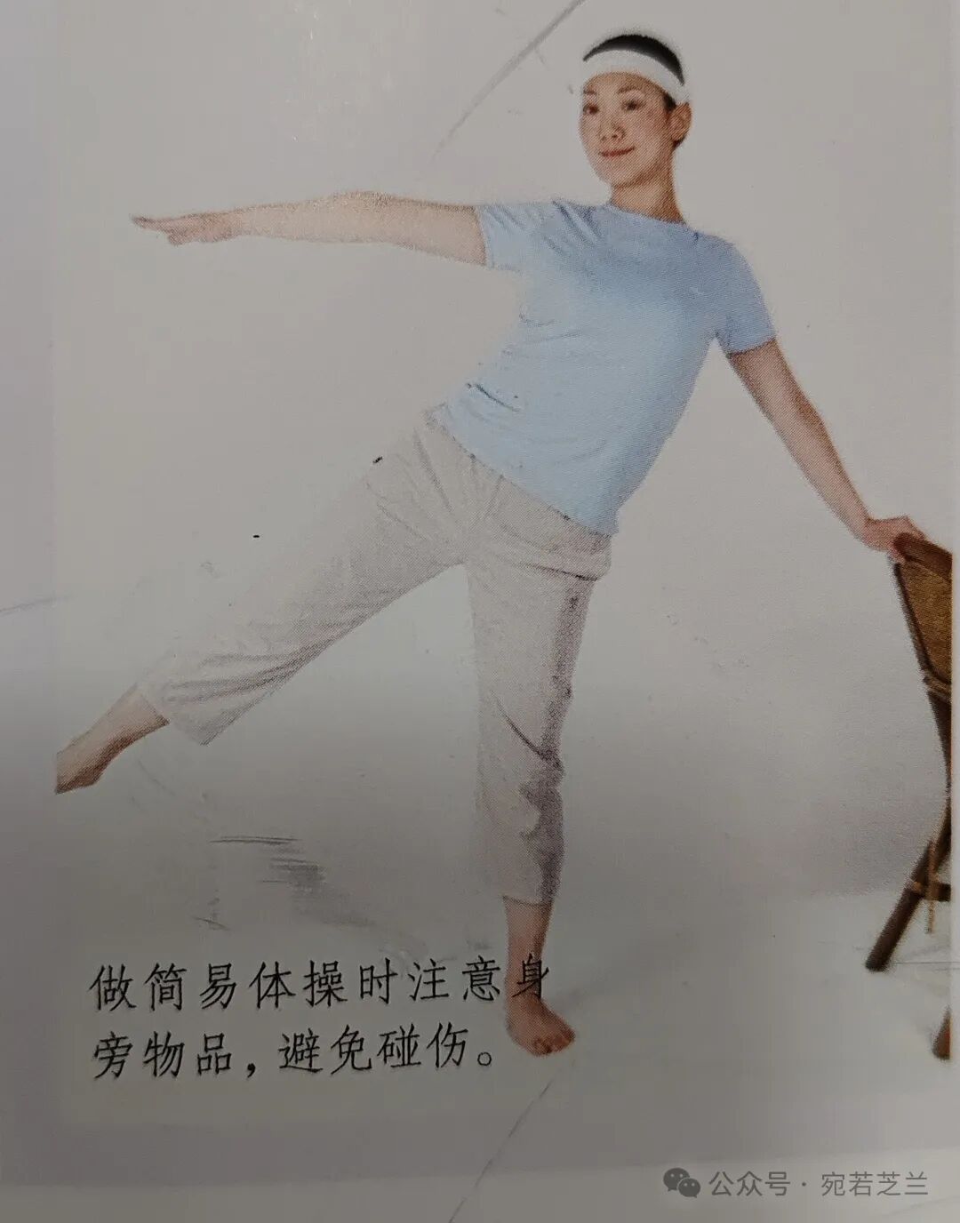 边,身体左侧对准椅子,左手扶椅子背部,前后摆动右腿,尽量每次都摆动到最大幅度为宜,然后右腿向外展、内收摆动数下。