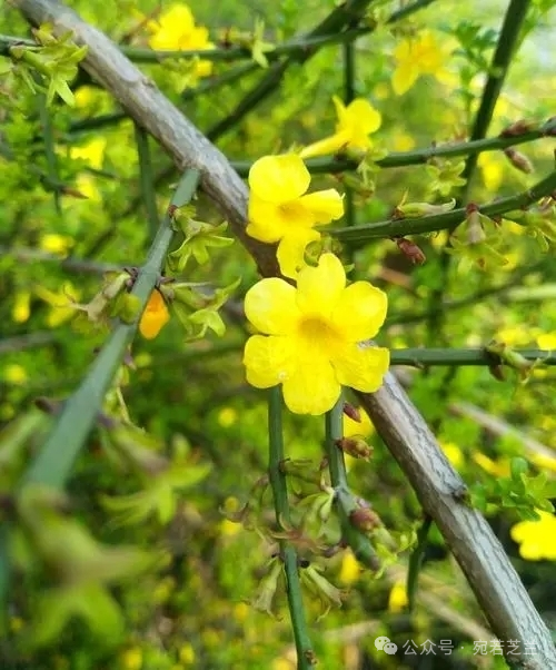 活力与生机:迎春花开放时花色亮黄且鲜艳夺目,寓意着生命的活力和勃勃生机,激励人们保持积极向上的态度。