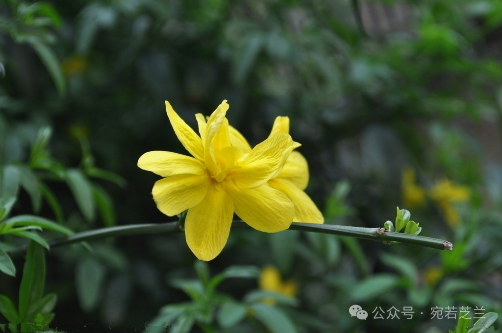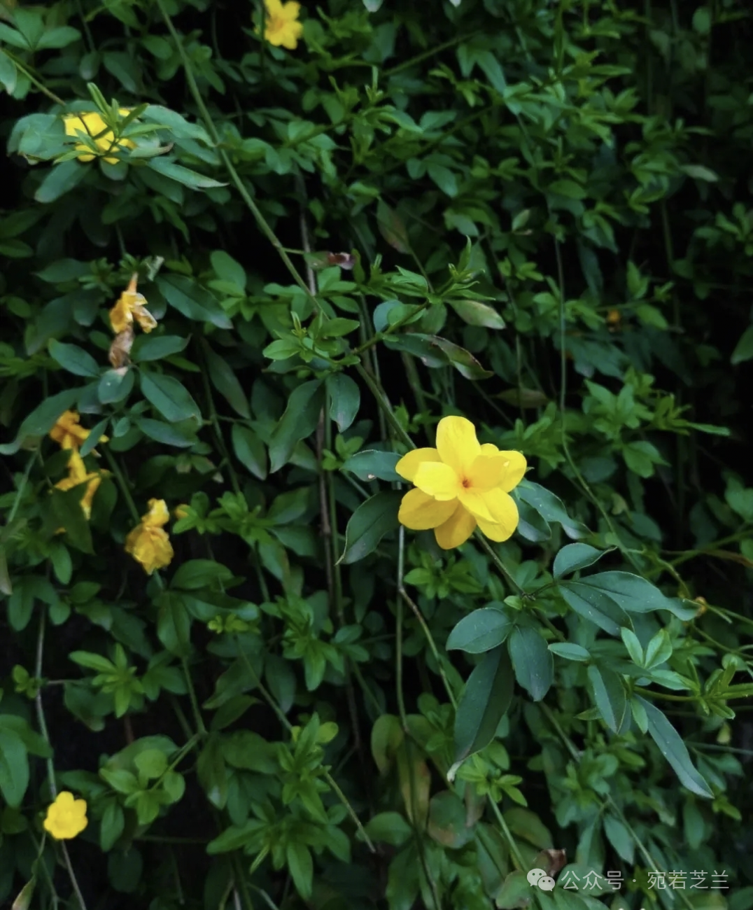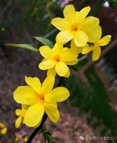 叶片翠绿,呈椭圆形或卵状披针形。花朵金黄色,花瓣细长而柔软,散发着淡淡的清香。