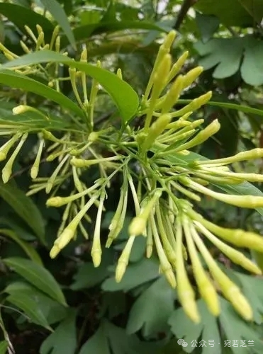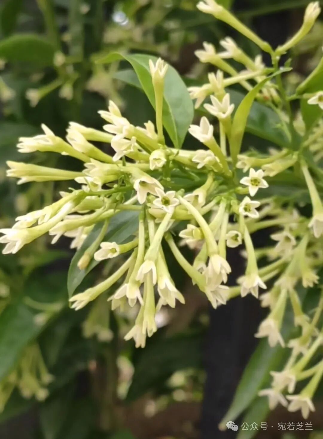 夜来香的花朵通常呈黄绿色,有的品种会略带粉色或紫色,花朵虽小,但香气浓郁,尤其是夜间,其香味更是能飘散至数米之外,令人陶醉不已。