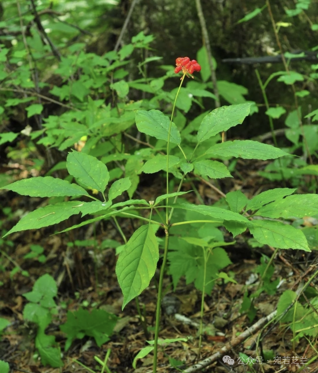 西洋参的叶片呈掌状复叶,对生或轮生于茎顶,翠绿的叶片在阳光下熠熠生辉,展现出勃勃生机。