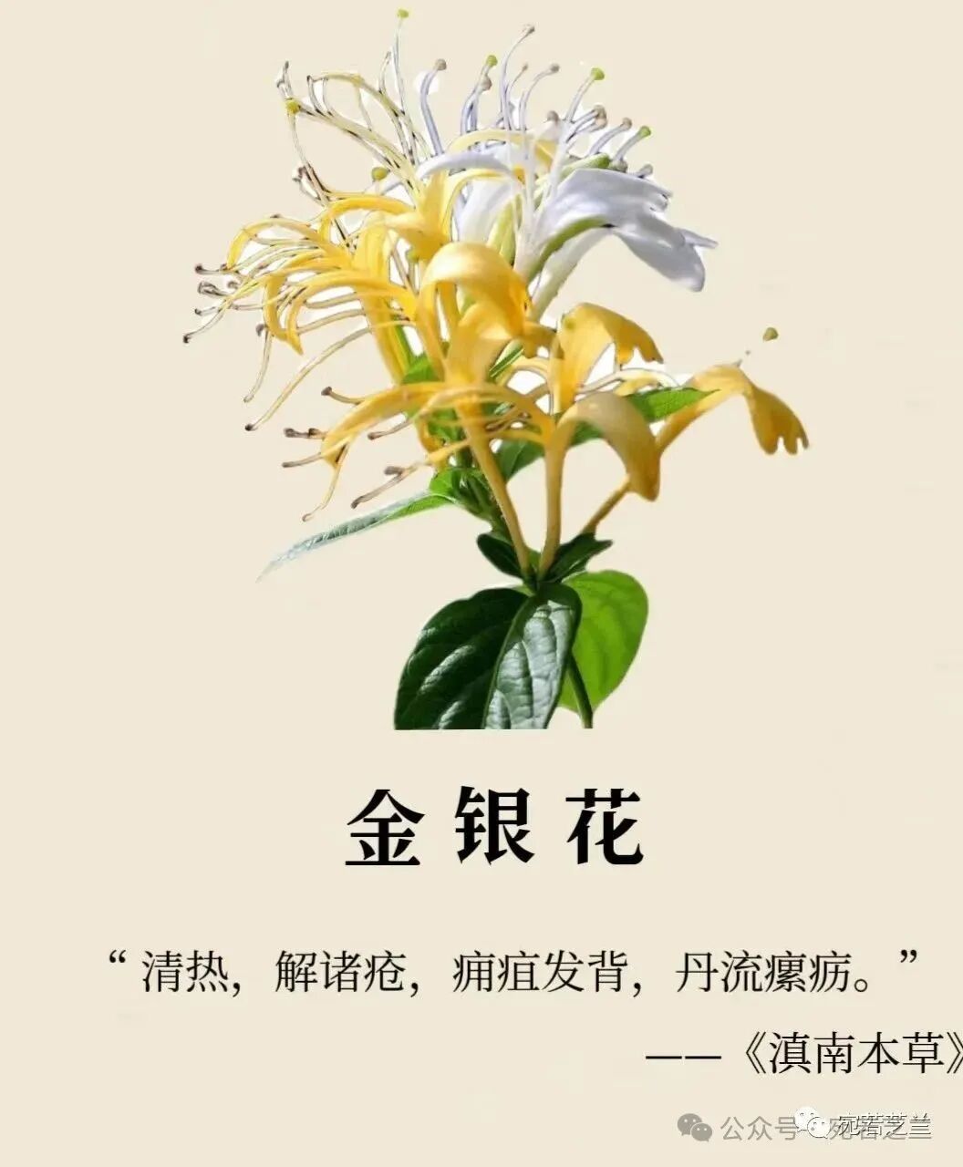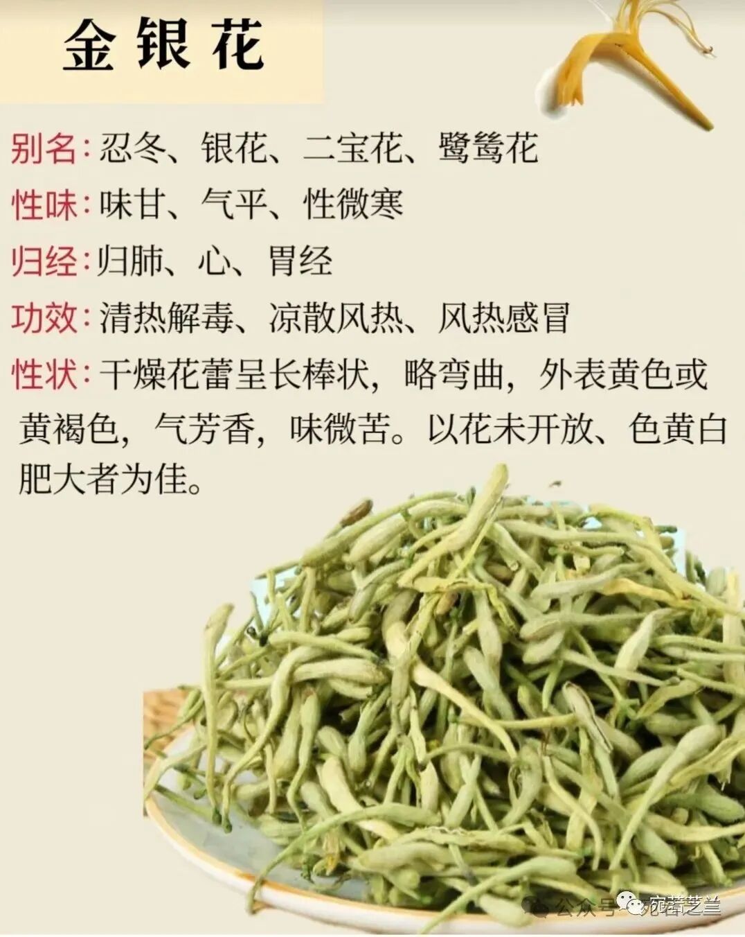 金银花在我国南北各地均有分布,为忍冬科植物忍冬的干燥花蕾或者初开的花,性味甘寒,气芳香,甘寒清热而不伤胃,芳香透达又可祛邪。
