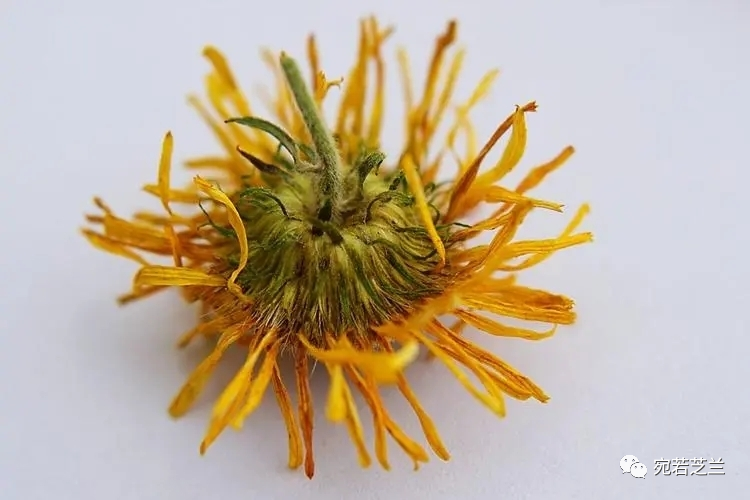 《本草衍义》曰:“花淡黄绿繁茂,圆而覆下。”故名旋覆花。