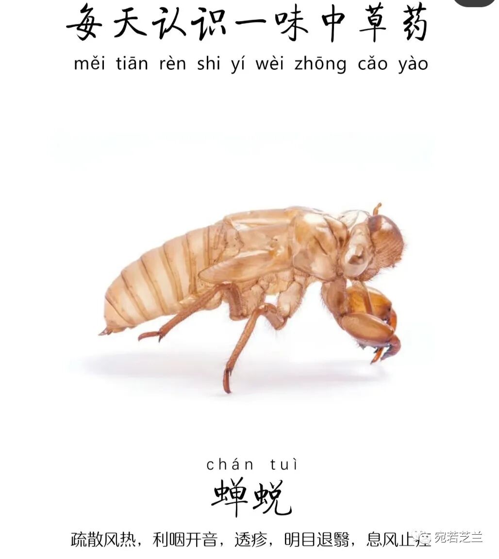每天认识一味中草药-蝉蜕-明目退翳蜕,为蝉科、无臭,味淡。
