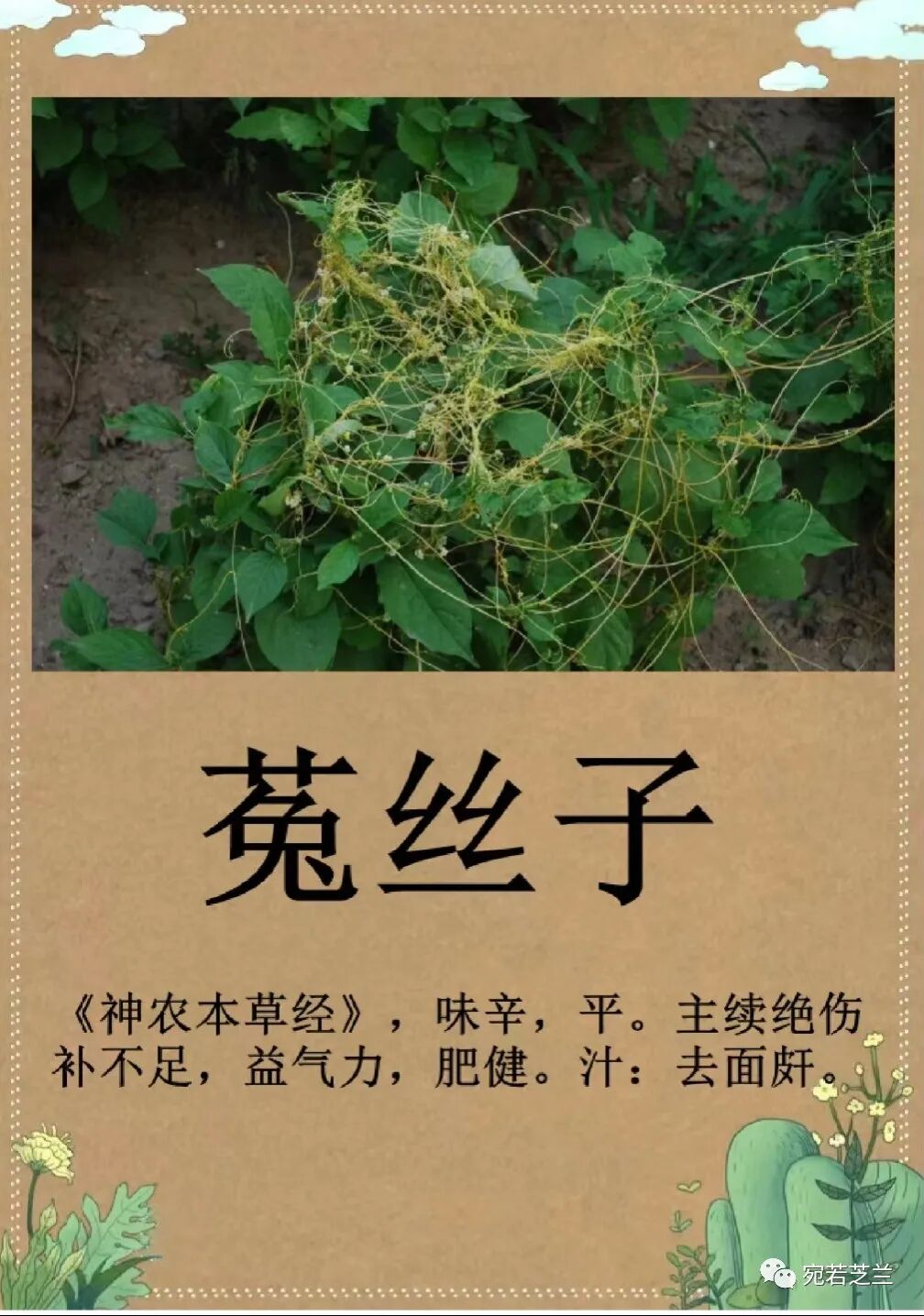 1、菟丝子归肝经、肾经,具有补益肝肾的功效,对于肝肾亏虚导致的腰膝酸软、头晕耳鸣、须发早白、神疲乏力、夜尿频多、小便清长、遗尿、遗精、阳痿等症状有一定的调理效果。
