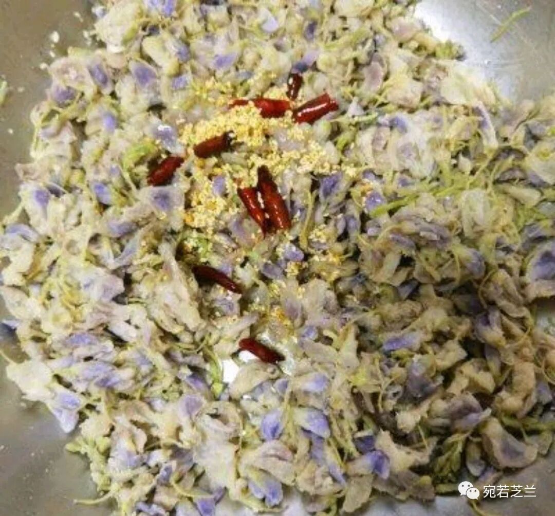 蒸好的紫藤花,盛入盆中,趁热放入适量盐,炒菜锅倒入适量油,凉油里加入切开的干辣椒和白芝麻,热油泼蒸好的菜上,拌均匀即可!