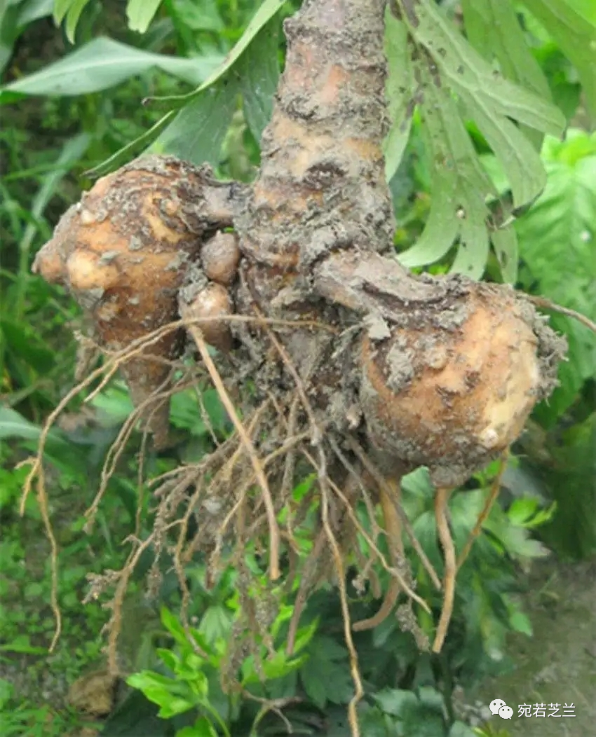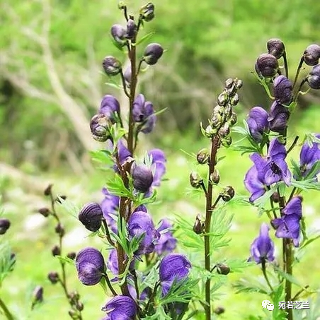 外形特征:白附子是一种多年生草本植物,根部肥大,呈椭圆形。叶子宽大而厚实,花朵为紫蓝色或白色,形状似乌头,因此得名"白附子"。整个植物有毒,应该谨慎使用。