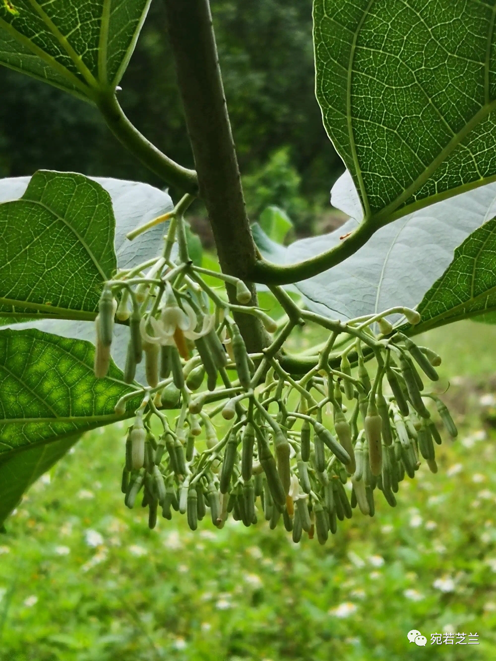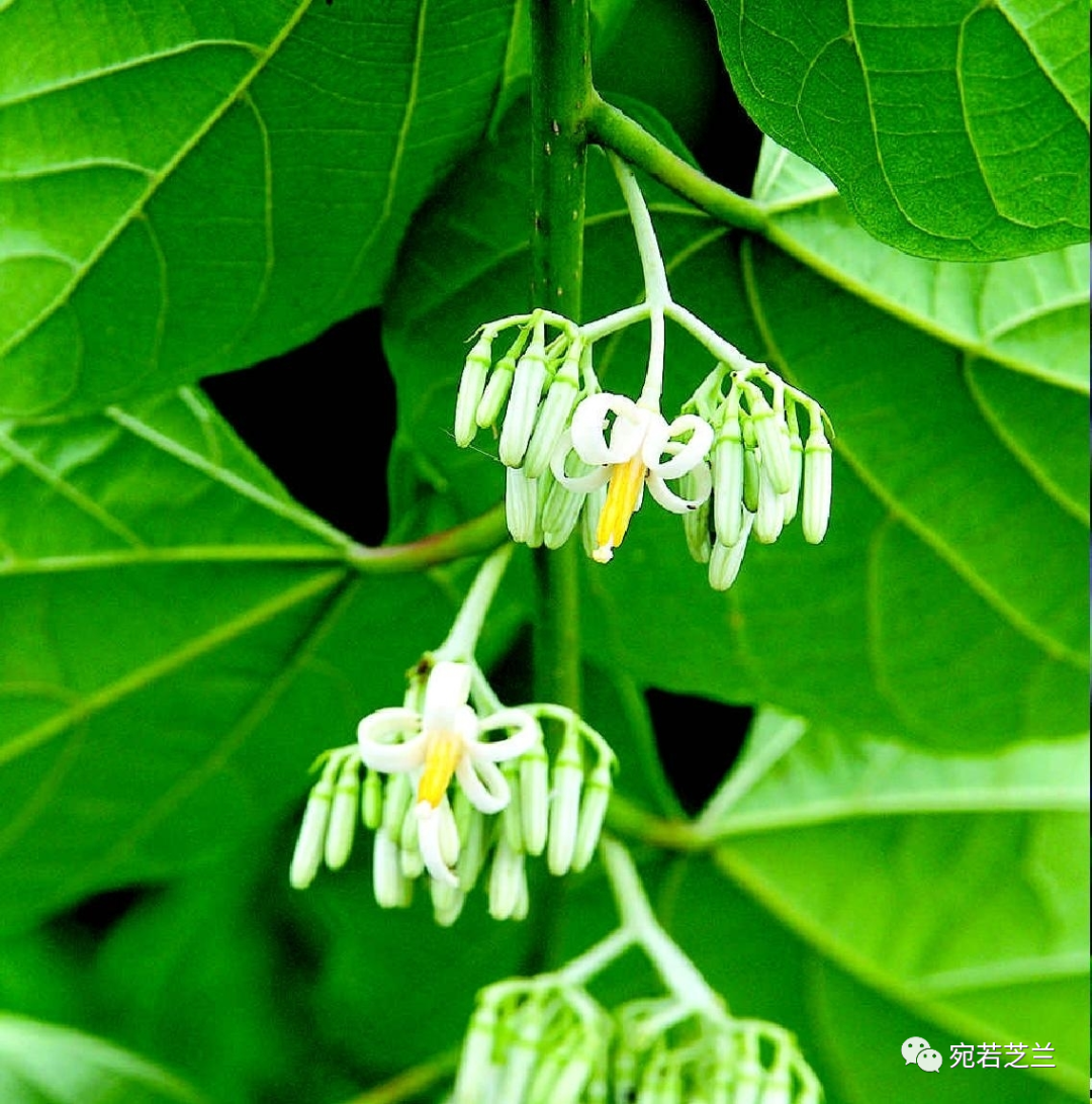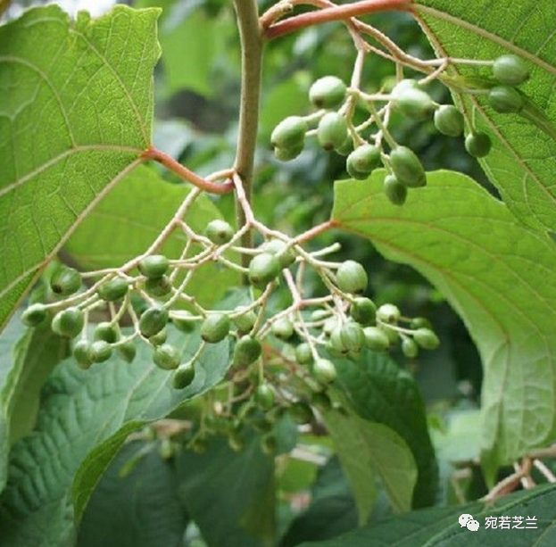 胸高直径20厘米,小枝略呈“之”字形,幼枝紫绿色,无毛或有稀疏的疏柔毛,冬芽锥形,生于叶柄的基部内,鳞片细小。叶纸质,近圆形或椭圆形、卵形,顶端短锐尖或钝尖,基部两侧常不对称,一侧微向下扩张,另一侧向上倾斜,阔楔形、截形、稀近于心脏形,长13~26㎝,宽9~22㎝,不分裂或3~9裂,裂片短锐尖或钝尖,叶上面深绿色,无毛,下面淡绿色,除脉腋有丛状毛外,其余部分近无毛;基出脉3~7,成掌状,侧脉3~5对,叶柄长2.5~3.5㎝,紫绿色或淡黄色,幼时有微柔毛,后无毛。聚伞花序腋生,长3-4厘米,被稀疏微柔毛,有7~30~50花,花梗长5~15㎜,小苞片线形或披针形,长3㎜,常早落,总花梗长1~1.5㎝,常分节,花冠圆筒形,长1~1.5㎝,花萼长2~3㎜,顶端分裂为5~8枚齿状萼片,长0.5~1㎜宽,2.5~3.5㎜,花瓣6~8,线形,长1~1.5㎝,宽1㎜,基部粘合,上部开花后反卷,外面有微柔毛,初为白色,后变黄色;雄蕊和花瓣同数而近等长,花丝略扁,长2~3㎜,有短柔毛,花药长6~8㎜,药隔无毛,外面有时有褶皱,花盘近球形,子房2室,花柱无毛,疏生短柔毛,柱头头状,常2~4裂。核果卵圆形,长约5~7㎜,直径5~8㎜,幼时绿色,成熟后黑色,顶端有宿存的萼齿和花盘,种子1颗。