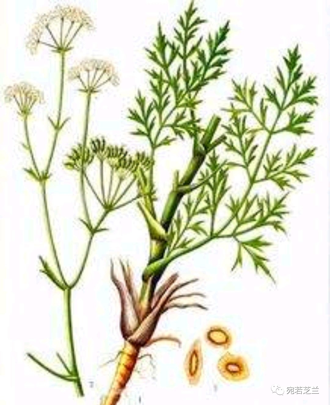 防风是 伞形科防风属多年生草本植物,高30~80厘米。根粗壮,主根为圆锥形,分歧,淡黄棕、褐色。根头处被有纤维状叶残基及明显的环纹。茎单生,自基部分枝较多,斜上升,与主茎近于等长,有细棱,基生叶丛生,有扁长的叶柄,基部有宽叶鞘。叶片卵形或长圆形,长14~35厘米,宽6~8(—18)厘米,二回或近于三回羽状分裂,第一回裂片卵形或长圆形,有柄,长5~8厘米,第二回裂片下部具短柄,末回裂片狭楔形,长2.5~5厘米,宽1~2.5厘米。茎生叶与基生叶相似,但较小,顶生叶简化,有宽叶鞘。复伞形花序多数,生于茎和分枝,顶端花序梗长2~5厘米;伞辐5~7,长3~5厘米,无毛;小伞形花序有花4~10;无总苞片;小总苞片4~6,线形或披针形,先端长,长约3毫米,萼齿短三角形;花瓣倒卵形,白色,长约1.5毫米,无毛,先端微凹,具内折小舌片。双悬果狭圆形或椭圆形等。