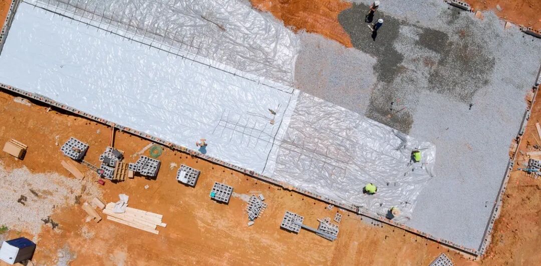 地基防潮处理:在地基上铺设聚乙烯薄膜防潮层,然后在其上浇筑钢筋混凝土筏式基础,这种方式防潮性能强,可以有效阻止地基中的水分上升进入室内。
