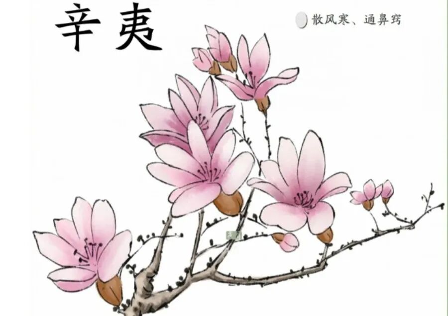 《名医别录》:“辛夷花利九窍,通鼻塞。”辛夷芳香,放在鼻子下面闻一闻,清香扑鼻而来,能感觉到有一股气直通鼻窍。