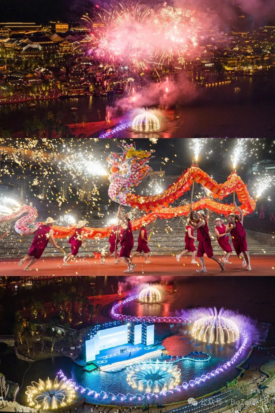 晚上的龙形水秀通过水、火、光、乐的融合,展现出震撼的喷泉表演,而结合当地山水竹文化元素的非遗独竹漂,更是被称为中国版的“水上芭蕾”。