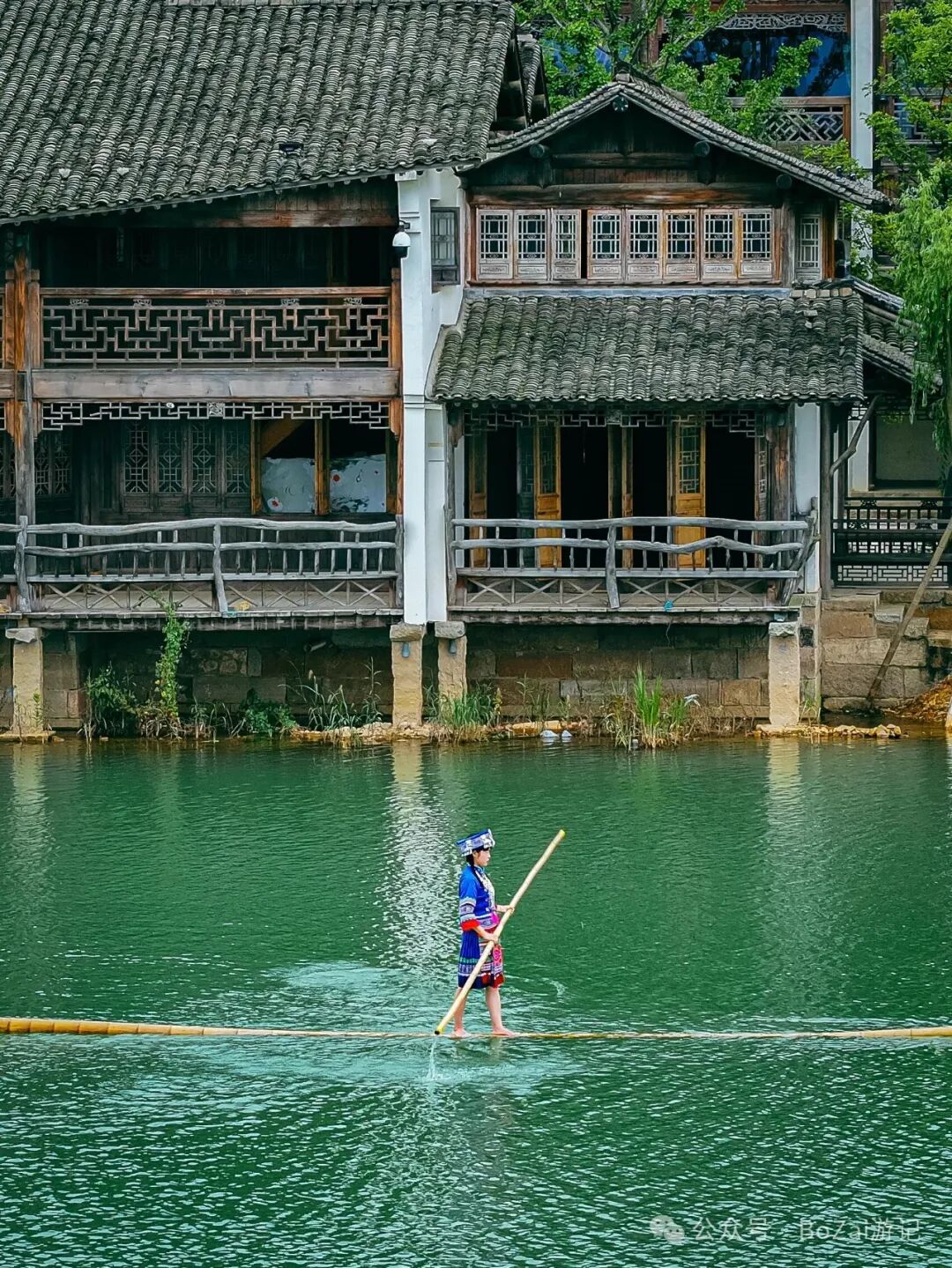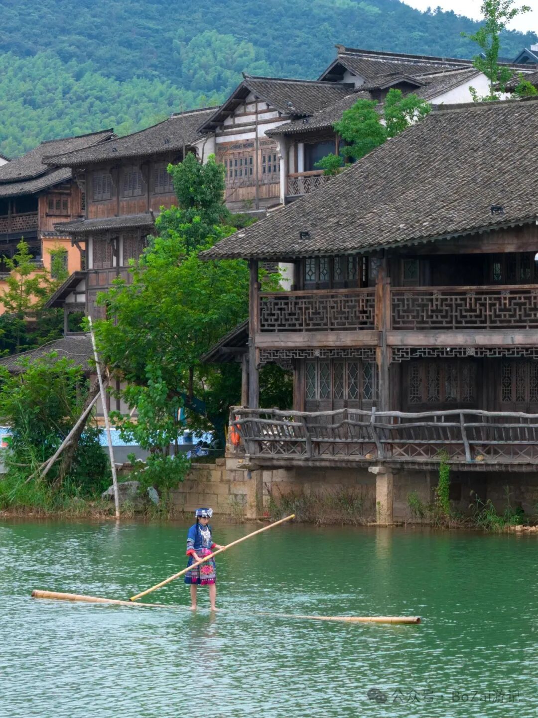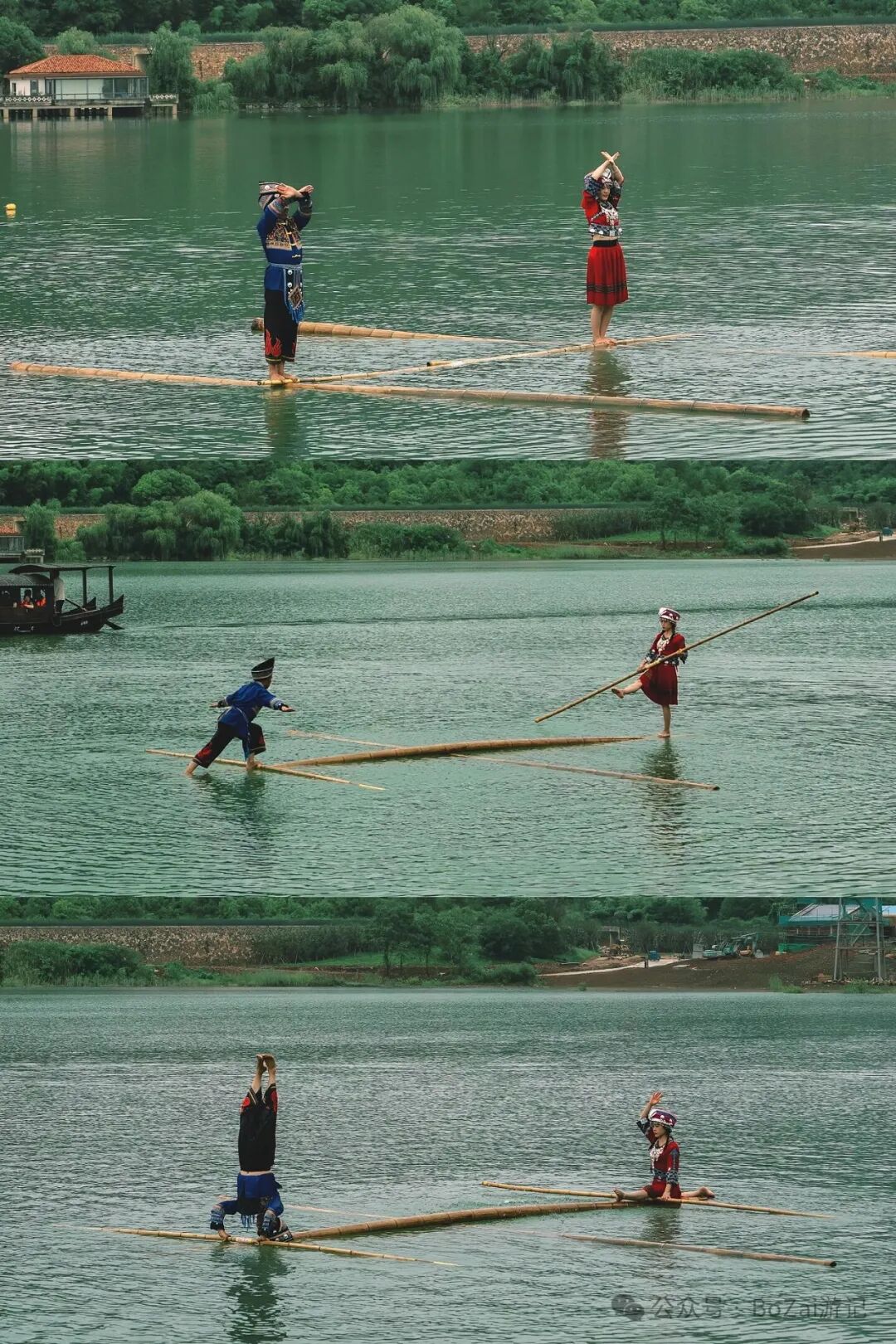 非遗表演——独竹漂令人赞叹不已。表演者仅凭一根竹子就能在水面上做出各种高难度的舞蹈动作,实在让人佩服。还有龙形水秀表演,住在景区里的朋友千万不要错过。