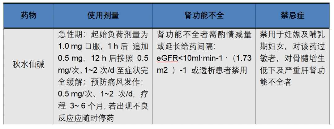 *首选秋水仙碱,若患者无法使用则选择非甾体类药物为其次选择。(如下表)