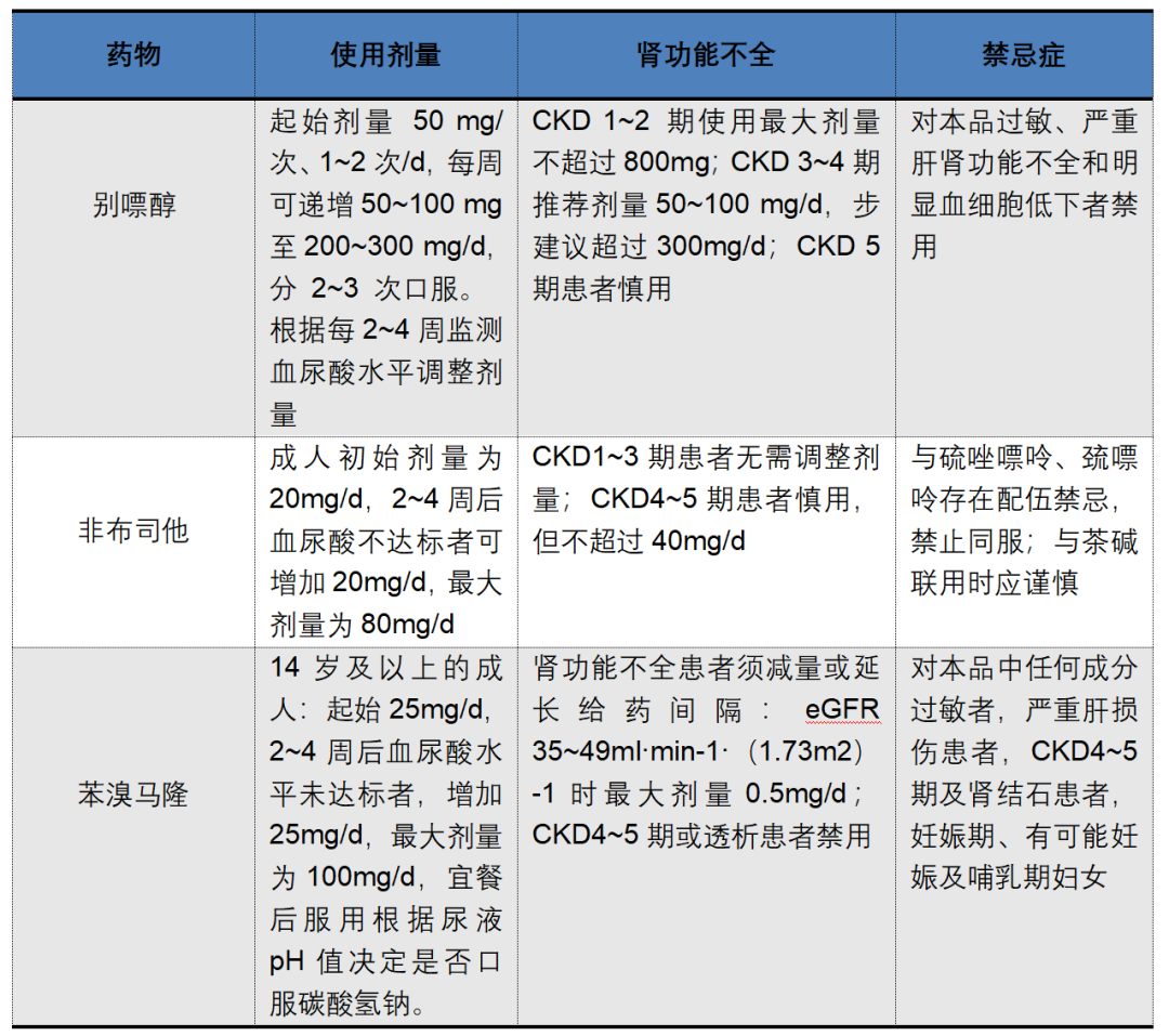 1. 所有降尿酸药物应从小剂量起始,建议每4周复查血尿酸,并结合血尿酸数值进行药物剂量调整;