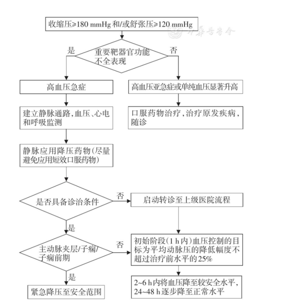 首先,应尽可能详细的评估,以明确是否为高血压急症,但起始的治疗不要因对患者进行整体评估时而延迟;
