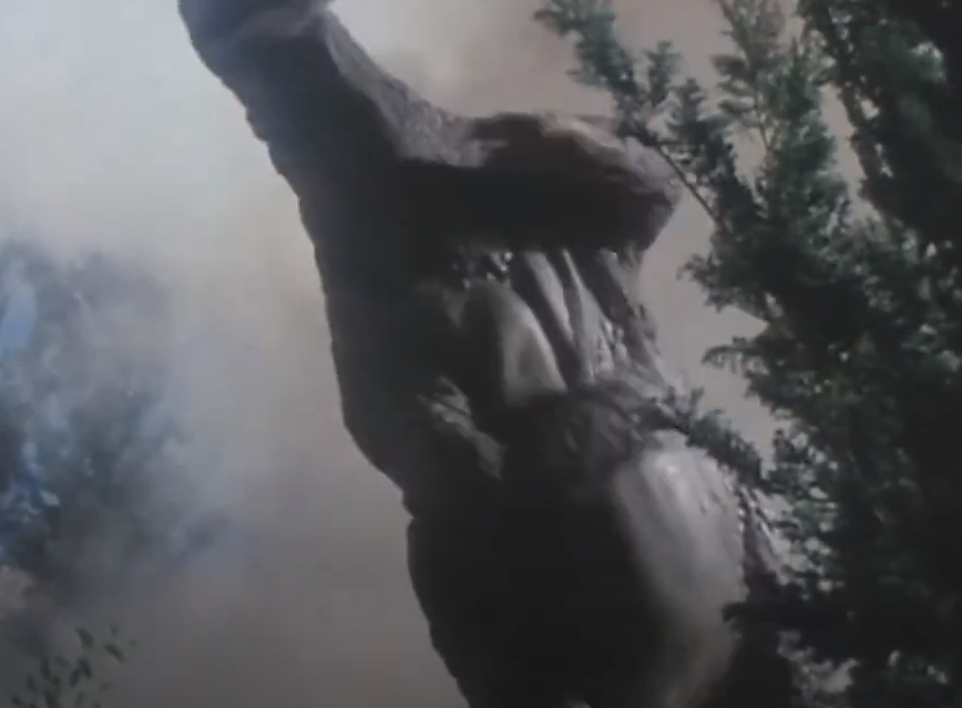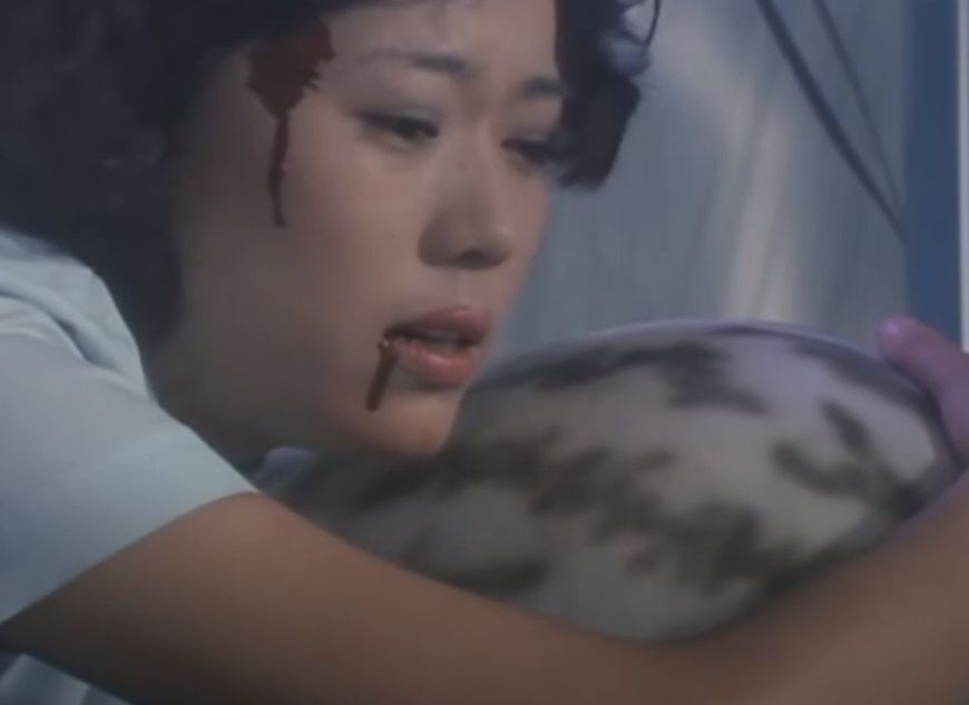 大姐姐为了保护即将出世的小恐龙,拼尽了最后一点力气,挡在恐龙蛋的前面,自己却被炸弹炸的太阳穴兹兹冒血。