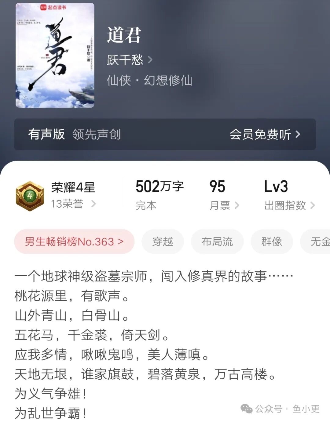 《道君》起点数据亮眼,荣誉四星,收藏量五十万起步,出圈指数三级等。