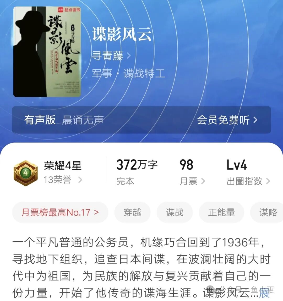 《谍影风云》收藏量五十万起步,荣誉四星,出圈指数四星,月票榜最高十七名,这数据算十分亮眼了。