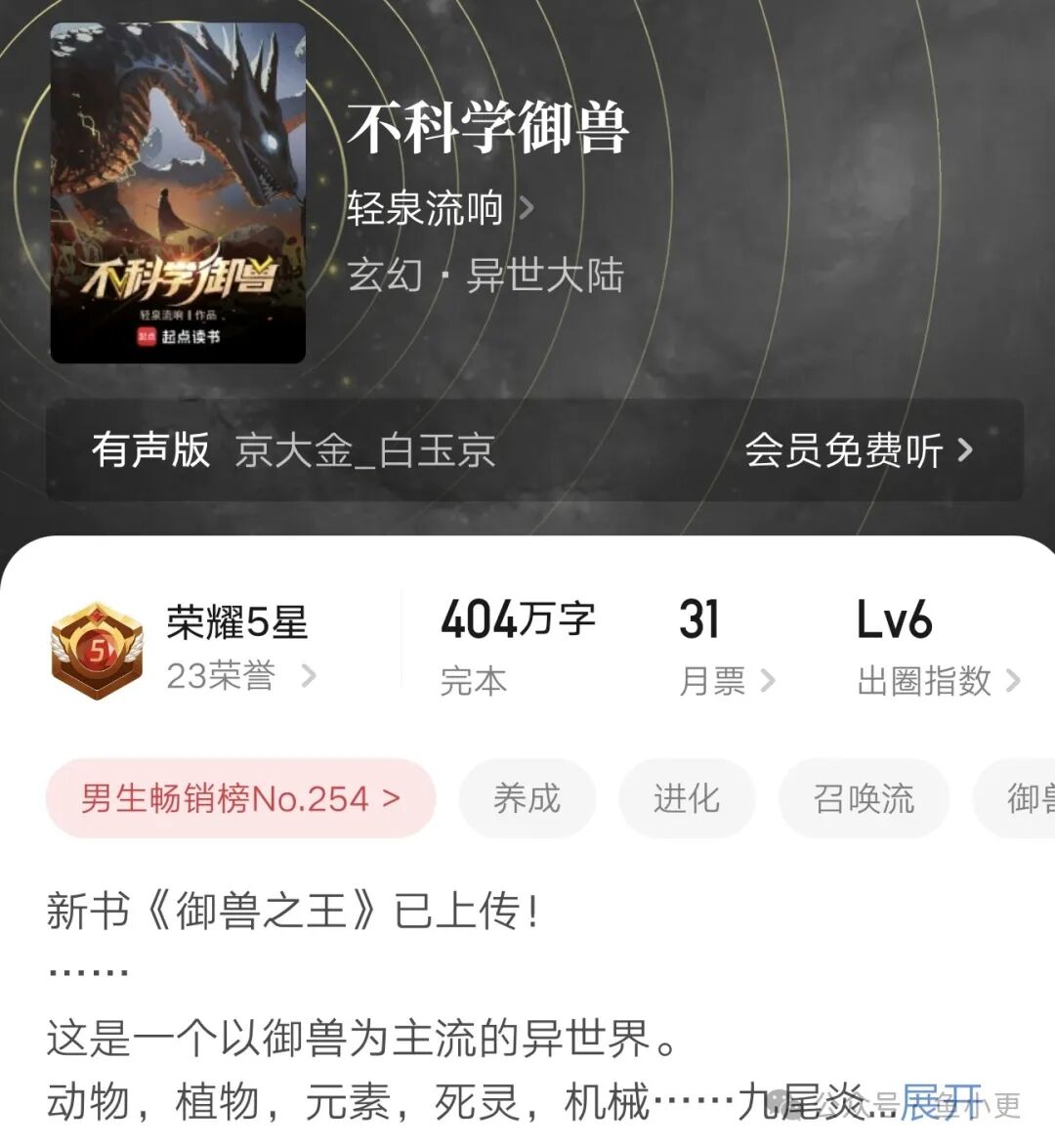 从数据上看,轻泉流响巅峰之作《不科学御兽》最高峰均订超过六位数,荣誉五星不在话下,出圈指数更是达到顶级六级。