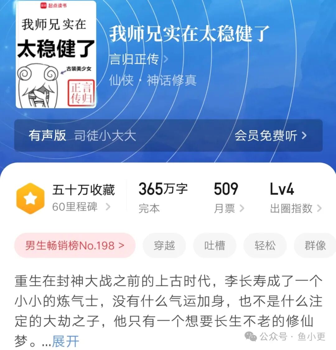 《我师兄实在太稳健了》荣耀四星,出圈指数四级,收藏量五十万起步,连载期间均订一万以上,最高均订六位数,完结了每个月都能获得不少的月票,说明还有不少读者在看。