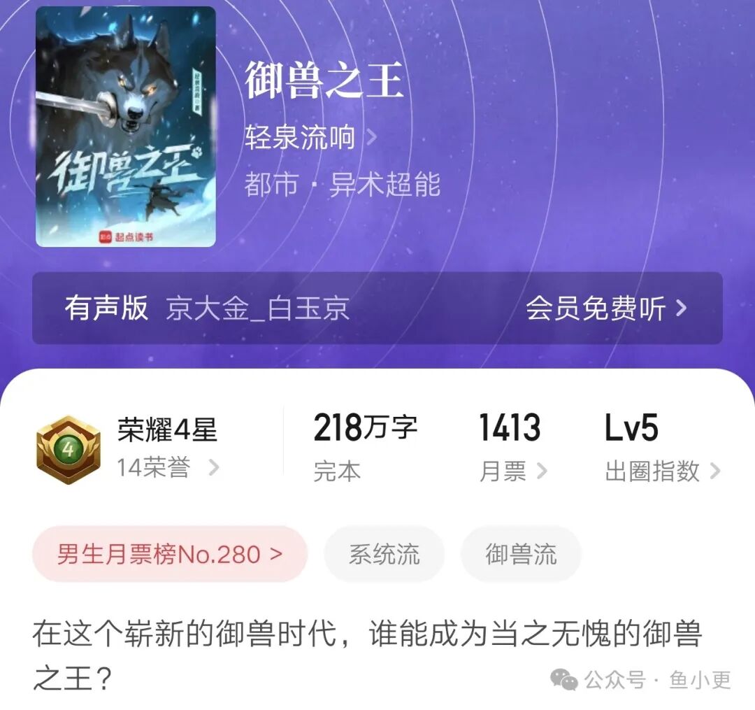 《御兽之王》两百万字出头就完结,获得荣誉四星,出圈指数五级,收藏量五十万起步,妥妥一本爆款精品书籍。