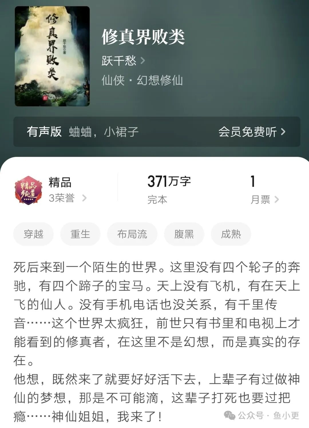 这是跃千愁写的第一本书!还有一本都市文《美女如云之国际闲人》因不符合要求被起点下架,小鱼就不去搜罗推荐了。